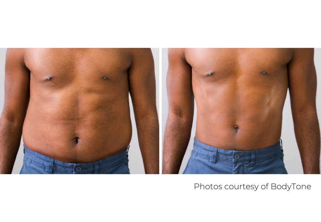 BodyTone is a body contouring procedure, which is ideally suited for women and men having a body mass index of up to 25. In other words, people with healthy body weight can expect to achieve the best outcomes. Muscle visibility is naturally higher in patients who have a relatively thinner body. However, even patients with a higher BMI will achieve core muscle strength gains just like others who have an ideal BMI.